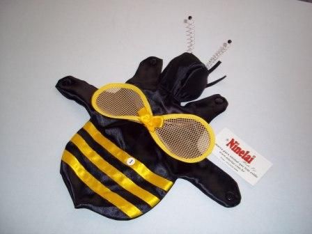 Fantasia Abelhinha, confeccionada com capuz, em cetim na cor preta, com fita de cetim amarelo. Detalhe: duas asas nas costas. Fechamento no pescoço e barriga.